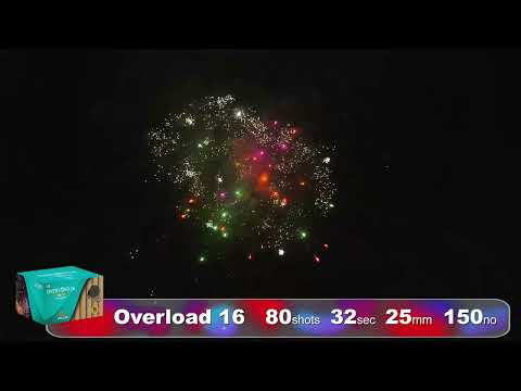 Overload 16 fra serien Overload hos First Class Fireworks er et 25 mm compound-batteri med 80 skud og en samlet krudtvægt på 941 g. Batteriet er skabt til nytårsaften og leverer et kraftfuldt, bredt og visuelt imponerende fyrværkerishow med intensitet og variation.