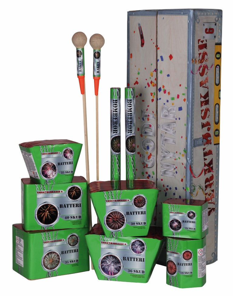 Værktøjskasse bestående af 7 stk. batterier med 19, 24, 25, 30, 35, 36 og 40 skud. 2 stk. bomberør samt 2 stk. raketter.